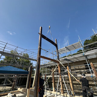 元請けさんがすごく良い足場を組んでくれているおかげで、柱や梁も組み易く、順調に進めることができました。