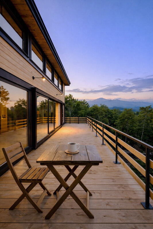 From the wood deck, one can enjoy sweeping views of the distant mountains and experience the changing beauty of nature throughout the seasons. The shifting scenery and light from morning to evening bring richness to everyday life and are among the greatest attractions that only this location can offer.