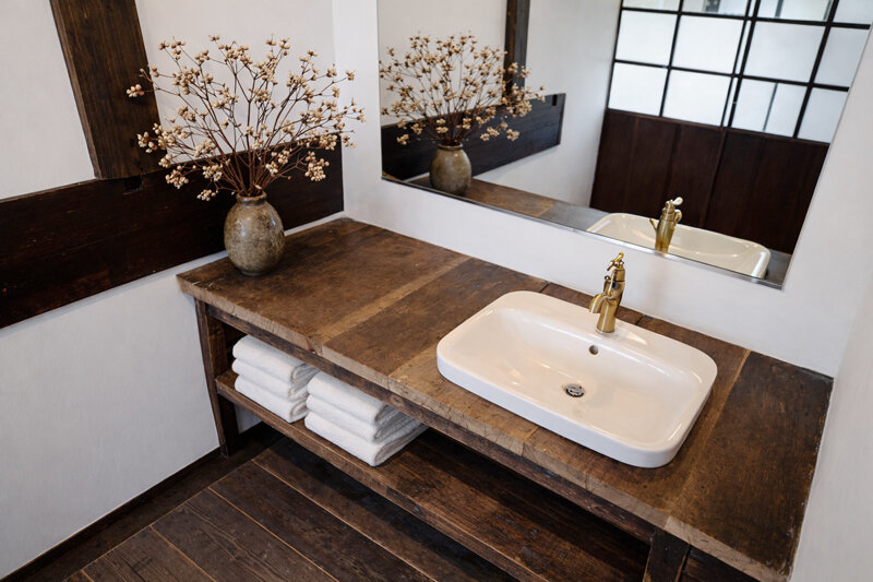 In addition, great care was taken during the relocation process to preserve the unique value of the kominka. Not only were the main structural members, such as the pillars and beams, carefully reused, but reclaimed timber was also extensively incorporated into elements such as the flooring and counters. The distinctive texture and character of aged wood provide a depth that cannot be recreated with new materials, giving the entire space a sense of calmness and dignity.