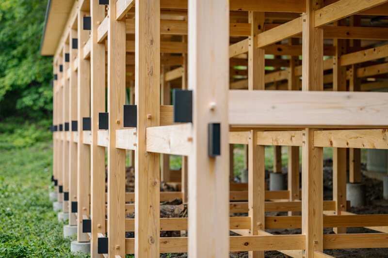敷地は高低差のある斜面であったため、「懸け造り」を採用しています。懸け造りとは、ジャングルジム状の柱と貫で建物を支えることで傾斜地に対応する日本の伝統的な建築方法であり、地形を活かした設計が可能になります。これにより、外観としての迫力と、最高の眺望が生まれています。