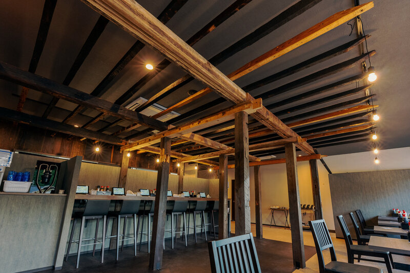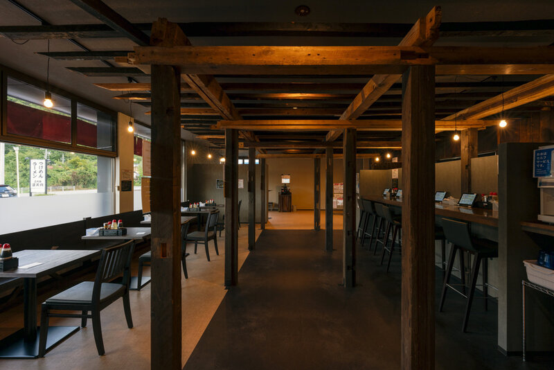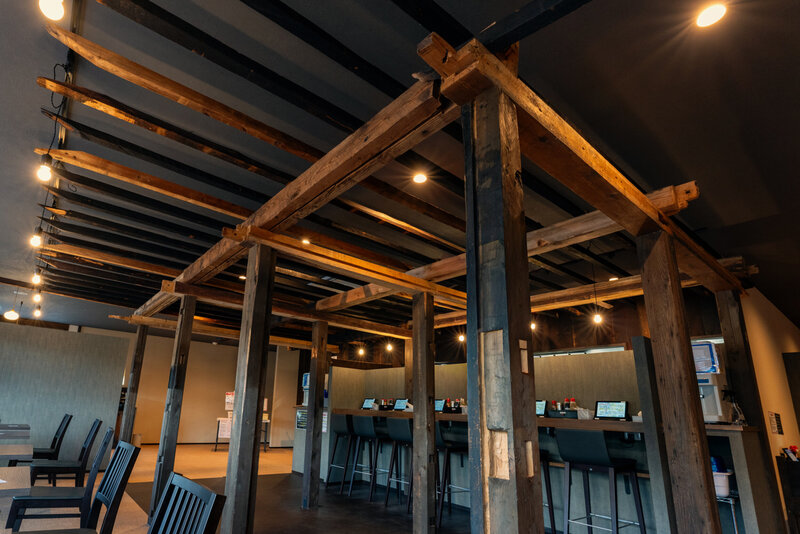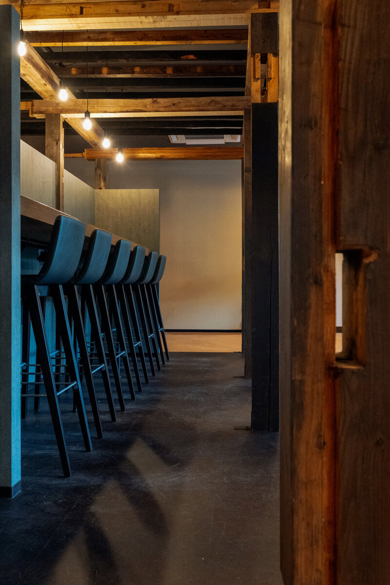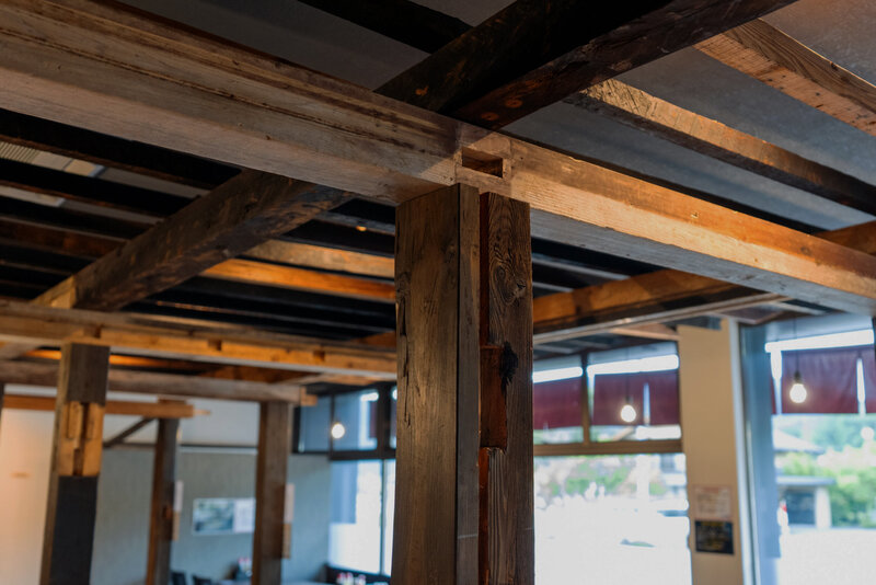 古材の柱、梁、板などを活用した飲食店の改修事例です。