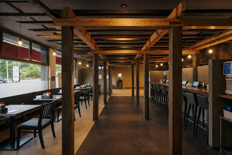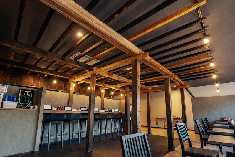 コンビニの空き物件をリノベーションし、らーめん店として再生した事例です。内装は古民家解体で発生した古材をふんだんに使用し、深みのある落ち着いた空間となりました。飲食店としての衛生面に配慮し、古材は丁寧に洗浄を行ったうえで再利用しています。