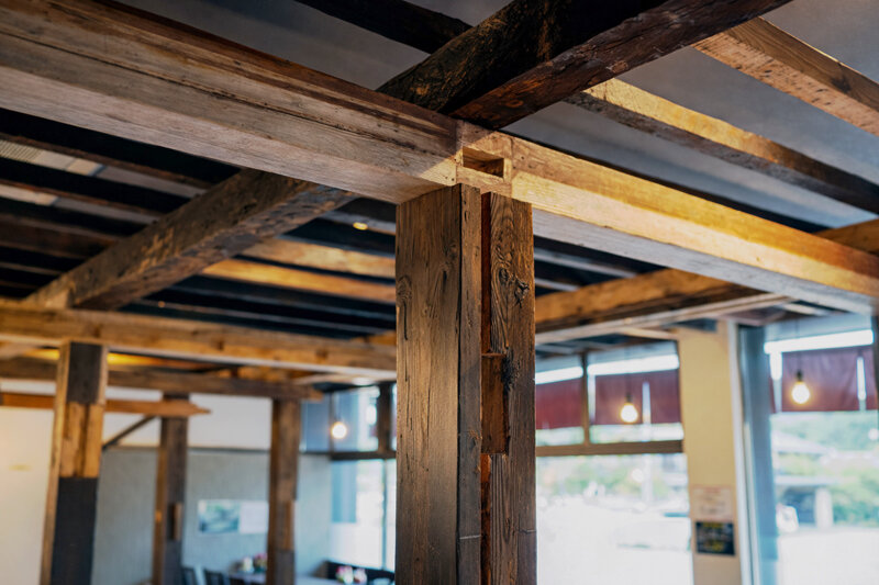 柱や梁には、かつての建物で使われていたホゾ穴や貫穴がそのまま残されており、長い年月を経た素材の歴史を感じることができます。こうした「手仕事の跡」が見えることで、新建材にはない独特の風合いが感じられます。